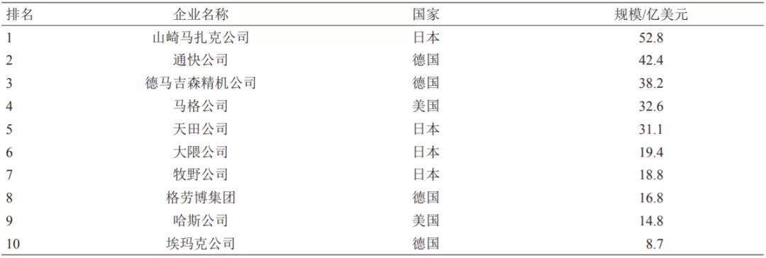 全球工作母机产业的发展大国和地区主要有美国、中国、日本和以德国为代表的欧洲。根据赛迪顾问统计,中国、日本和德国是机床的主要生产国家。2019年日本数控机床产业规模占全球比重约为32.1%,是全球第一大数控机床生产国。中国数控机床产业规模略低于日本,占全球比重约为31.5%。德国整体产业规模占全球比重约为17.2%。然而,全球高档数控机床龙头企业主要集中在德国、日本和美国(见表1),日本山崎马扎克株式会社、德国通快集团以及德日合资的德马吉森精机公司(DMGMORI)稳居行业龙头地位。