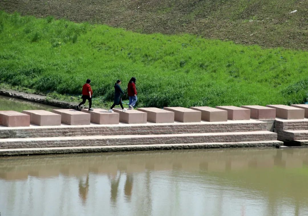 ▲市民在公园散步,穿过梁滩河。雷键 摄