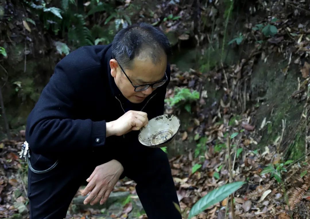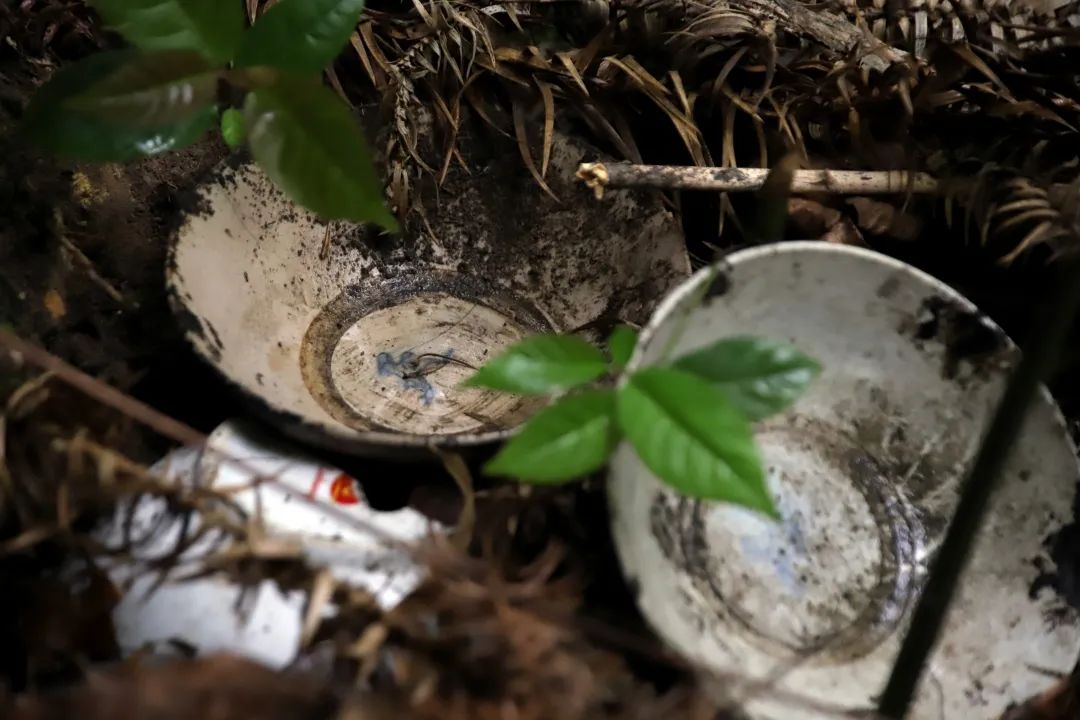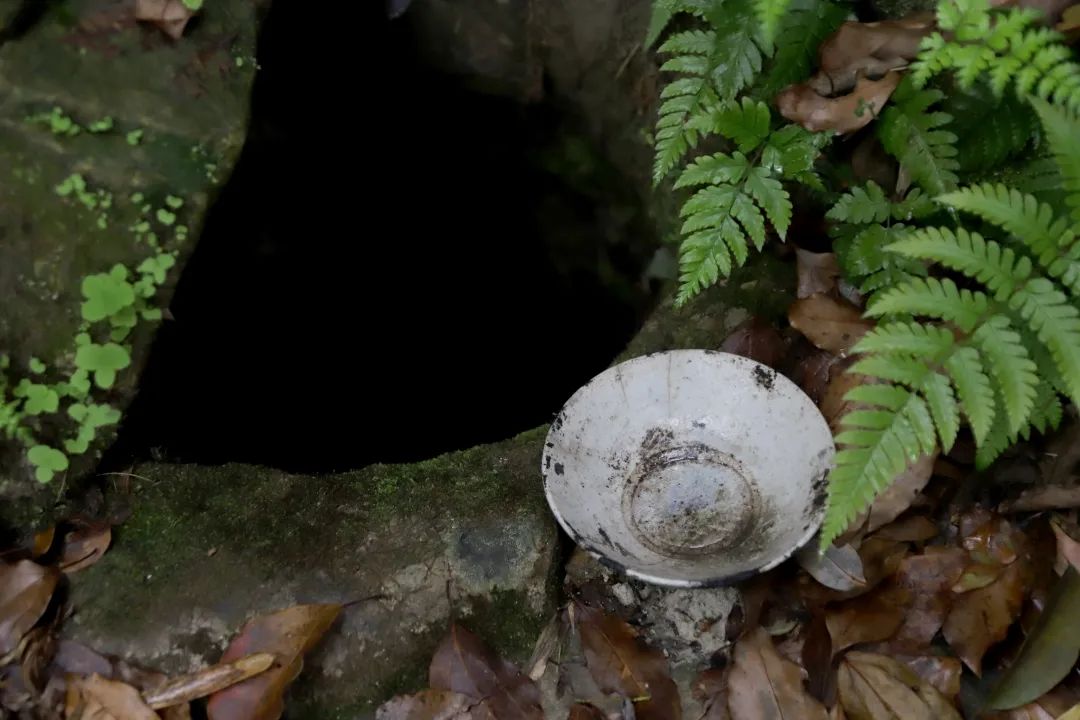 ▲井边草丛泥土中,偶尔还能看到遗留下来土碗。走马镇文服中心工作人员杨华现场鉴定,估计土碗属于清朝年间。雷键 摄