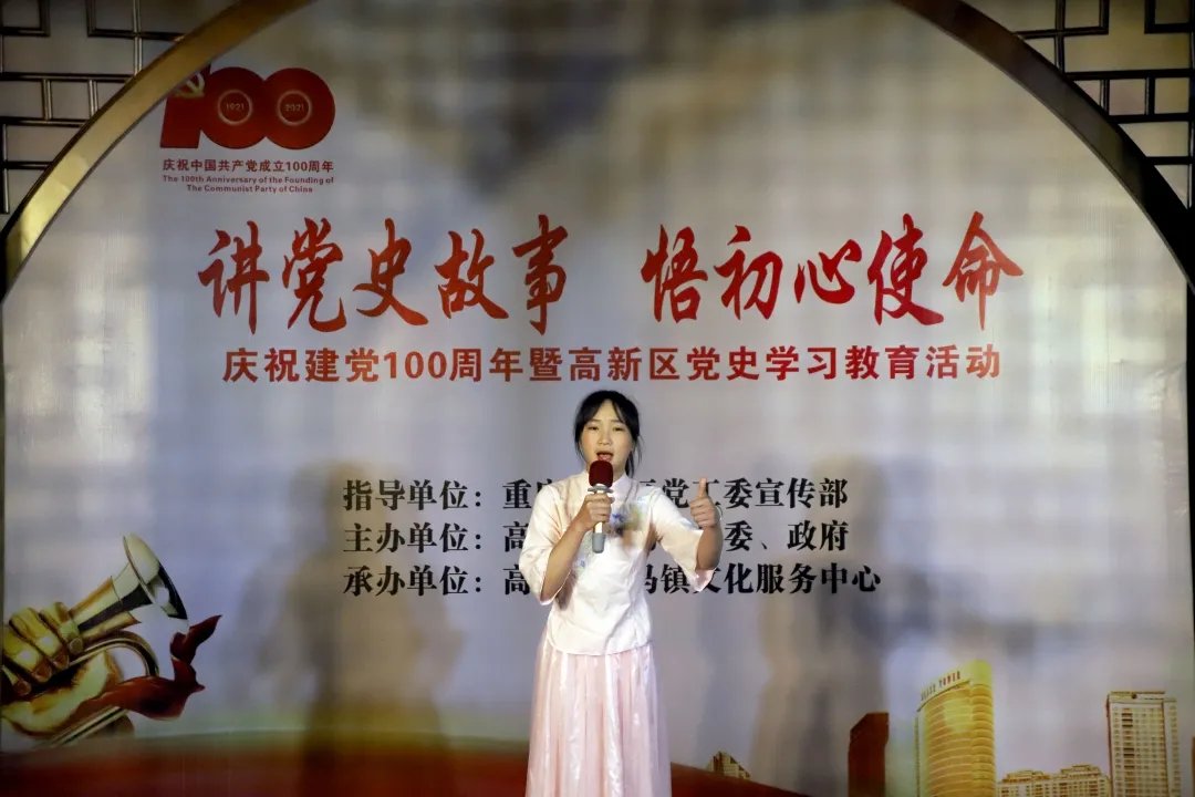 活动现场,由走马中学和走马小学教师讲述的《巾帼英雄江竹筠》和《一个老政治犯的红蓝铅笔》都令大家阵阵感叹,其中走马镇椒园村李少秋的原创作品《两个辛丑年》更是让大家百感交集,通过对比百年前后新中国的变化历程让现场观众从回望过去到展望未来,如同身临其境般。