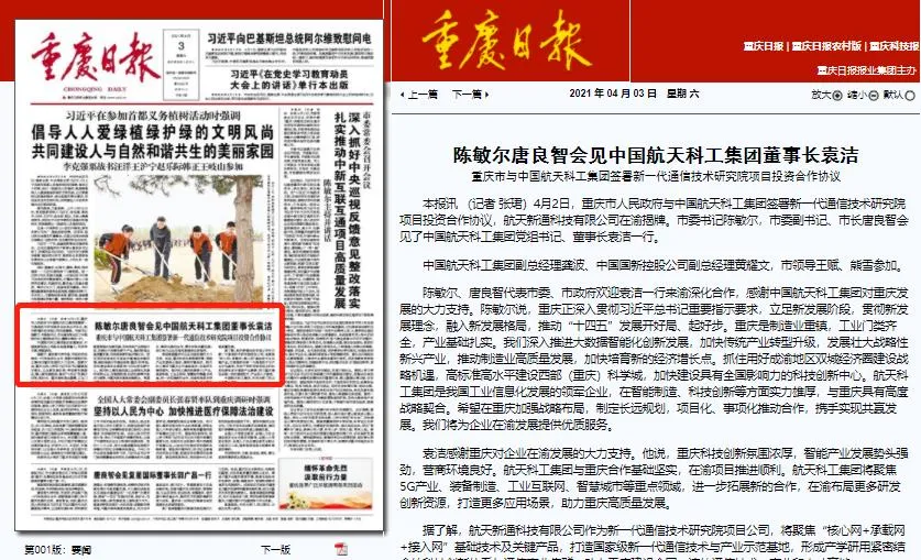 4月2日,重庆市人民政府与中国航天科工集团签署新一代通信技术研究院项目投资合作协议,航天新通科技有限公司在渝揭牌。市委书记陈敏尔,市委副书记、市长唐良智会见了中国航天科工集团党组书记、董事长袁洁一行。