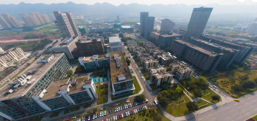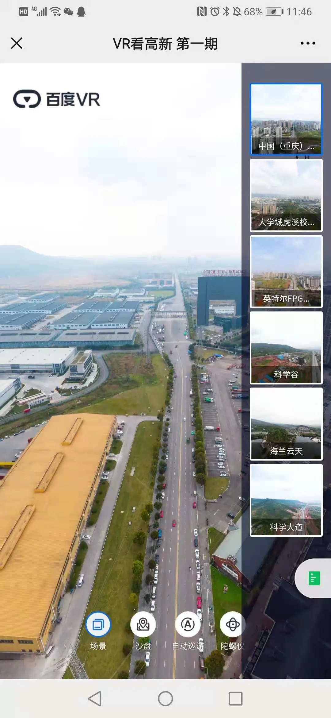 点击进入后,下方“场景”选中的状态下,可以直接点击中国(重庆)自由贸易试验区、大学城虎溪校区、英特尔FPGA中国创新中心、科学谷、海兰云天、科学大道等地方,实现场景转化。