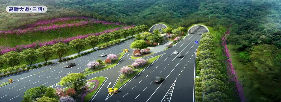 高腾大道为科学城核心区“六横六纵”骨架网体系之一,三期项目包含改造和新建道路约1.8km,新建双向六车道隧道1.1km。建成后将成为金凤片区与含谷片区联系的主要交通通道之一,加强科学公园东西两侧的交通联系。