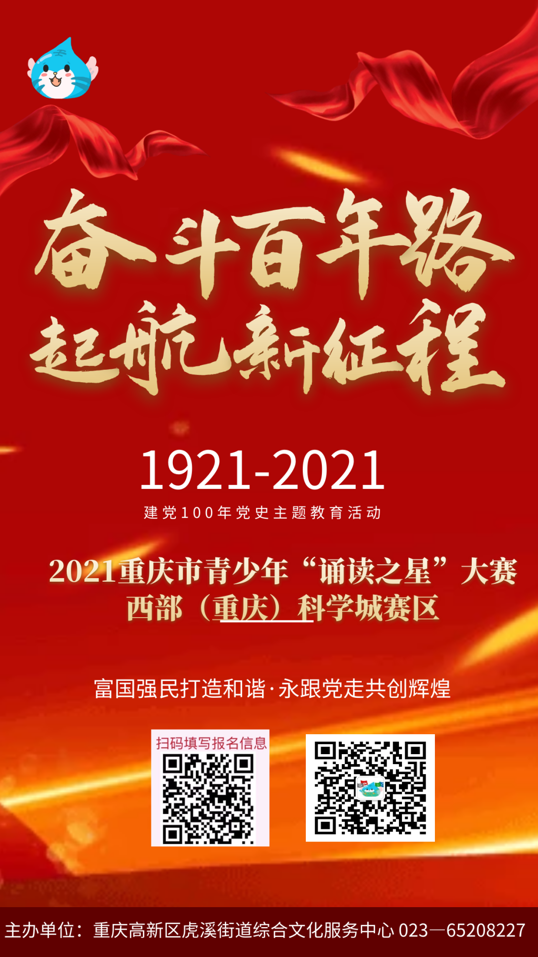 2021重庆市青少年“诵读之星”大赛西部(重庆)科学城赛区火热报名中:比赛采取一轮比拼方式,一场比赛即确定晋级名单。报名截止时间为4月17日20点,比赛时间为4月24日10点至12点、14点至17点,比赛地点是虎溪街道综合文化服务中心(龙湖U城星座2号3楼)。点击图片识别二维码了解详细报名信息。