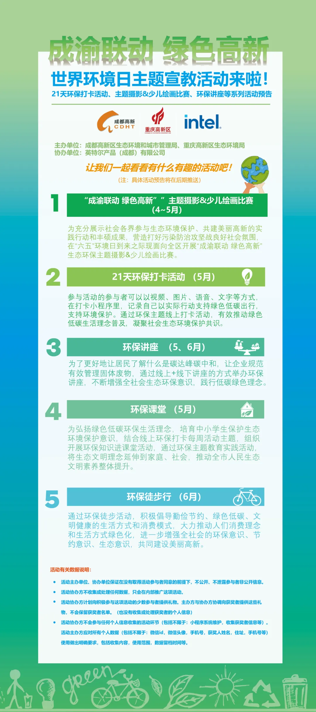 面向成渝高新区征集100名志愿者,通过环保徒步活动,积极倡导勤俭节约、绿色低碳、文明健康的生活方式和消费模式,大力推动人们消费理念和生活方式绿色化,进一步增强全社会的环保意识、节约意识、生态意识,共同建设美丽高新。