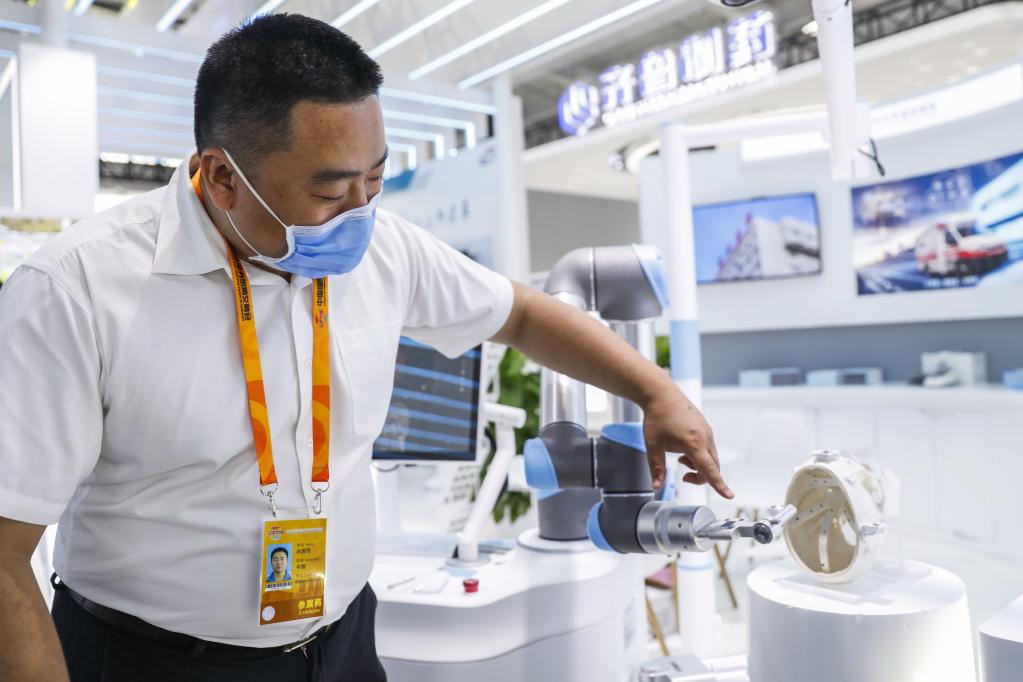 9月5日,在服贸会首钢园区健康卫生服务专题展北京宣武医院展台,工作人员在介绍神经外科手术机器人。(新华社记者张玉薇摄)
