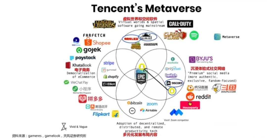 再看国内厂商,以腾讯为例,马化腾口中描述的“全真互联网时代”与元宇宙高度吻合。在AR、VR、互联网等关键领域,腾讯已经多有涉足,重点投资了沙盒游戏,早在2012年便以3.3亿美元购入Epic Games 48.4%的股权。从下图就可以看出,腾讯的触角已经遍布了整个元宇宙产业链。