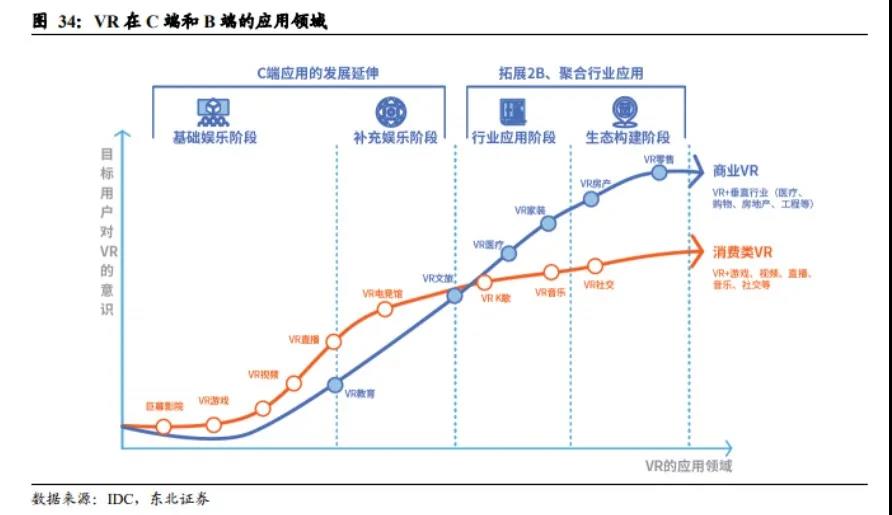根据东北证券整理数据显示,未来VR的发展方向将从C端不断分化至B端,消费类VR将从影视、游戏、直播逐渐发展为VR社交,这也是Facebook、爱奇艺、华为,以及字节跳动等企业构建VR生态的终极目标。而商业VR将VR生态版图扩展到教育、医疗、家装、房产及零售等商业领域。