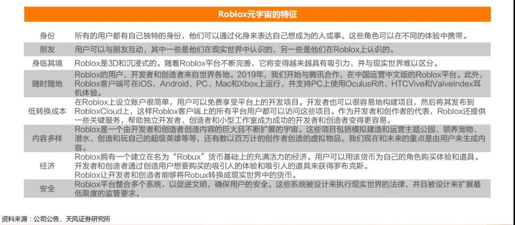 图:Roblox对元宇宙的定义(图源:天风证券)