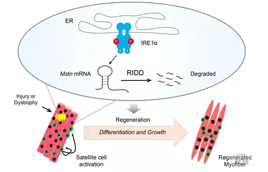 进一步的分子机制研究发现,在肌肉细胞分化和生长过程中,IRE1α利用其核酸内切酶的RIDD活性降解肌肉生长抑制素的mRNA。简言之,在肌肉损伤诱导的再生过程中,肌肉细胞被激活的IRE1α核酸内切酶通过调节肌肉生长抑制素,进而促进成肌细胞分化和肌管生长。