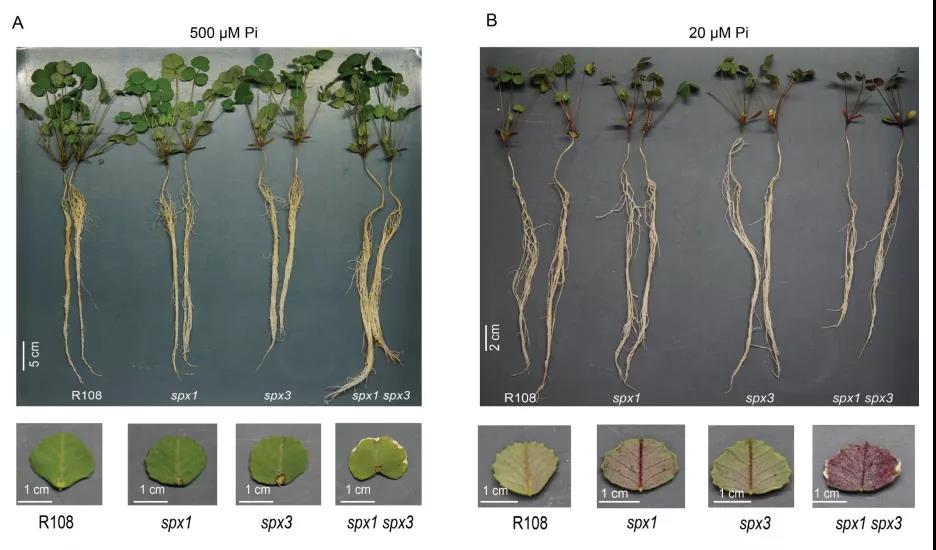 研究人员首先通过系统进化分析,在苜蓿中鉴定到6个与水稻和拟南芥同源的SPX基因,通过磷胁迫实验,发现其中SPX1和SPX3,在缺磷状态下显著上调表达;随后研究人员对SPX1和SPX3的时空表达及调控模式进行了探究。经过对SPX1和SPX3突变体进行分析,发现在磷充足情况下,SPX1和SPX3负调控磷饥饿反应(Phosphate Starvation Response, PSR),而在磷匮乏条件下,SPX1和SPX3增强PSR反应。