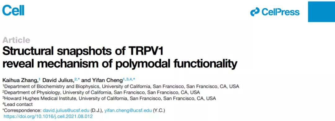 北京时间2021年9月7日晚23时,美国加州大学旧金山分校程亦凡实验室和David Julius实验室在Cell杂志发表研究论文——“Structural snapshots of TRPV1 reveal mechanism of polymodal functionality”。