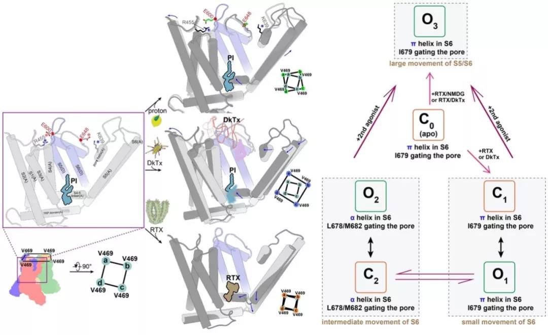 生物体局部组织的酸聚集也能开启TPRV1的信号传导。过去的功能性实验证明TRPV1胞外侧的两个氨基酸构成对酸响应的关键位点。基于解析的多个中间态构象,作者直接观察到了这两个氨基酸位点是如何在酸条件下发生局部结构性变化并逐步影响TPRV1的构象。虽然这些中间态并非处于完全开放状态,但类似于DkTx作用时的S1-S4 结构域构象变化诠释了酸环境对TPRV1开放的促进作用。