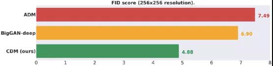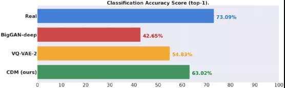 图5 ImageNet 在 256x256 分辨率下的分类准确度得分,衡量在生成的数据上训练的分类器的验证集准确度(越高越好)。CDM 生成的数据比现有方法获得了更显着的效果,缩小了真实数据和生成数据之间在分类精度上的差距。