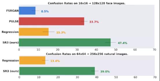他们进行了一项两种可选的强制选择实验,要求受试者被问及“你猜哪个图像来自相机?”时,在参考的高分辨率图像和 SR3 模型输出的高分辨率图像之间进行选择,谷歌团队通过混淆率来衡量模型的性能(评估者选择模型输出的图像与参考图像的时间百分比,其中完美的算法将实现 50% 的混淆率)。这项研究的结果如下图所示。