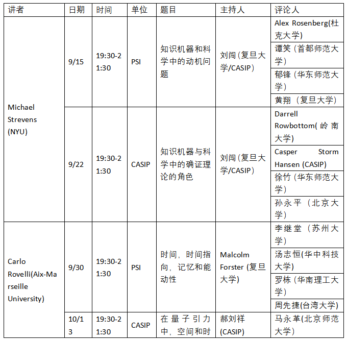 中国科学院哲学研究所(CASIP)与复旦大学智能科学与智能哲学研究中心(PSI)将于本秋季学期在Zoom上联合举办主题为科学与哲学的国际系列讲座,《返朴》作为协办方将全程于B站直播(直播账号:返朴科普)。邀请的报告人或为具有崇高的哲学情怀、广阔的哲学视野和深邃的哲学思想的哲人科学家,或为具有理性的科学精神、广博的科学知识和严谨的科学思想的科学哲学家。报告内容聚焦于科学前沿中的基本哲学问题,以及与哲学紧密相关的科学问题。(讲座安排详见下表)