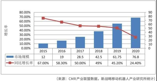 据中国移动机器人产业联盟、新战略移动机器人产业研究所统计数据显示,中国工业应用移动机器人(AGV/AMR)产品销量从2016年的11300台增长至2020年的41000台,年均复合增长率高达38%。市场规模也从2016年的19亿元增长至2020年的76.8亿元,复合增速高达41.8%。