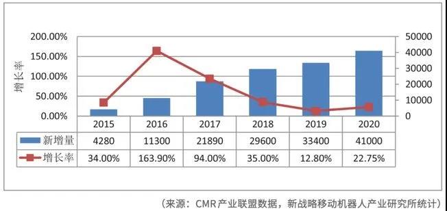 2015~2020中国工业应用AGV/AMR市场规模/新增量与增长率