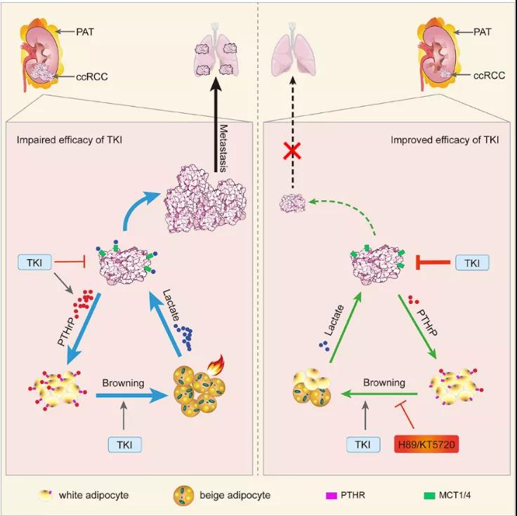 总结图:ccRCC与邻近脂肪组织之间存在“双向通讯”,这促进了ccRCC的进展。TKIs药物能够促进ccRCC相邻PAT发生棕色化而具有“副作用”,而联合TKIs药物和抑制脂肪细胞棕色化的药物(诸如H89或KT5720)能够增强TKI药物的抗肿瘤效果。