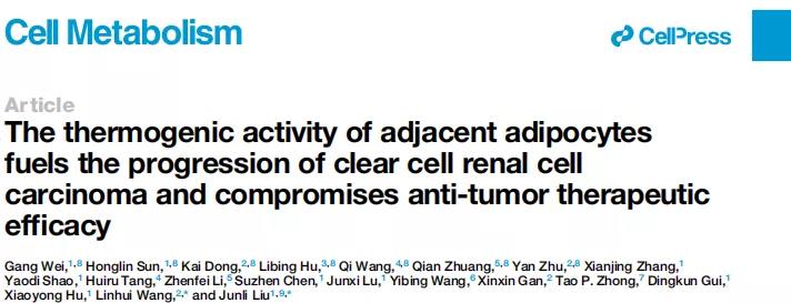 2021年9月10日,上海交通大学附属第六人民医院刘军力课题组联合上海长海医院泌尿外科王林辉课题组在Cell Metabolism在线发表了题为 The thermogenic activity of adjacent adipocytes fuels the progression of ccRCC and compromises anti-tumor therapeutic efficacy 的研究论文。作者揭示了肾透明细胞癌与相邻肾周脂肪之间存在一种“双向通讯”模式(bi-directional communication)。ccRCC能够促进肾周脂肪发生棕色化,棕色化后的肾周脂肪又通过分泌过量乳酸促进ccRCC肿瘤的生长、侵袭和转移。作者进一步发现,当通过多种途径(基因干预或药物抑制)阻断这种“双向通讯”模式能够显著抑制ccRCC的生长和转移。特别是,采用脂肪棕色化抑制剂(H89或KT5720)可以有效增强晚期肾癌一线药物舒尼替尼(sunitinib)的疗效,具有重要的临床转化意义。