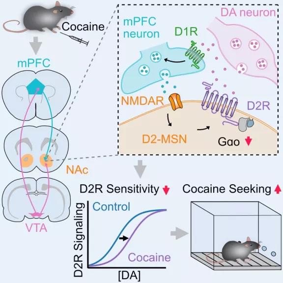 多巴胺是大脑中奖赏系统的主要神经递质,纹状体(DSt)和伏隔核(NAc)的多巴胺信号传递在调节学习和目标导向行为方面发挥着核心作用。滥用药物引起的这些回路功能障碍被认为是成瘾的关键。早期对可卡因成瘾的人类以及非人类灵长类动物的正电子放射X射线断层摄影术(positron emission tomography ,PET)研究发现,多巴胺受体(特别是 D2 受体)可用性的降低与可卡因(cocaine)滥用有关。除此以外,通过基因或病毒方式改变啮齿动物的多巴胺 D2 受体表达的研究显示,D2 受体(D2R)水平的降低可能是可卡因暴露的关键后果以及成瘾相关的原因行为。然而,这项工作的局限性在于,神经影像学 (PET) 研究无法确定 D2 受体可用性的降低是由于D2受体的表达改变所致,还是由于 D2 受体定位、运输、敏感度或下游信号功效改变所致。