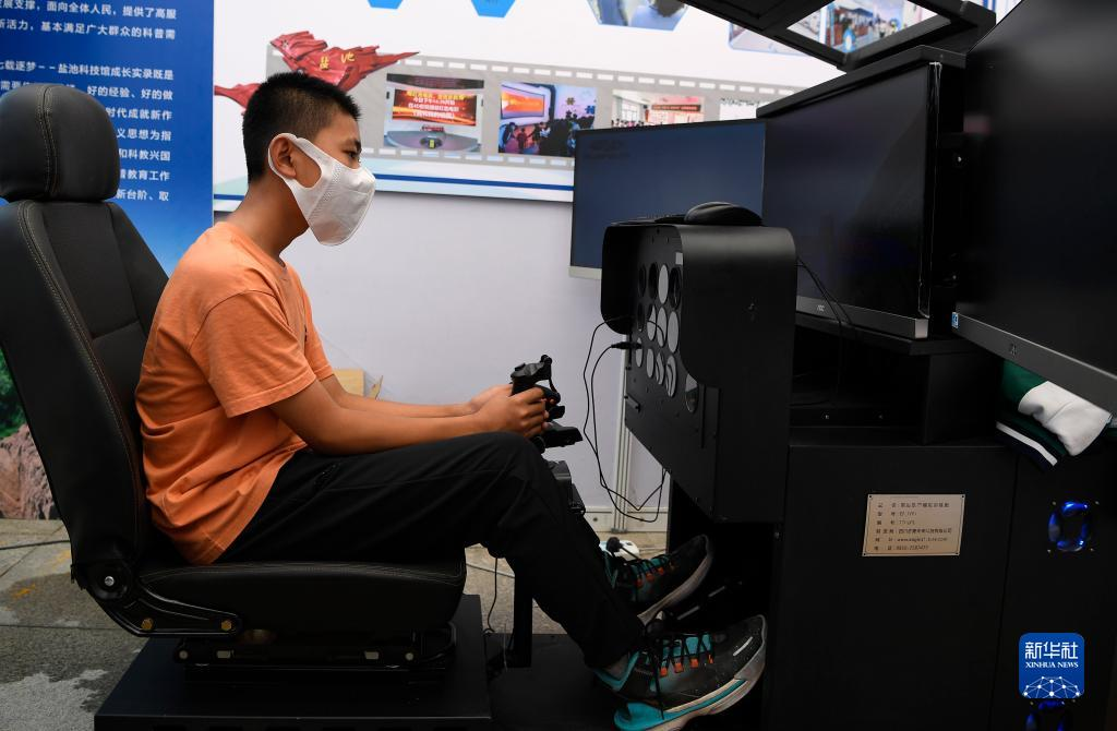 9月11日,一名学生在活动现场体验飞机模拟驾驶。新华社记者 王鹏 摄