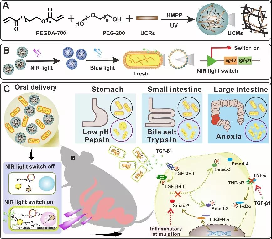 本文利用“纳米光遗传学”技术,构建了一种能够实现在体肠道靶向精准定植的光响应型生物活药工程菌,同时对工程菌进行遗传改造使其分泌抗炎因子,在小鼠模型中证明这种工程菌促进了粘膜的愈合,可改善DSS诱导的慢性结肠炎相关症状。