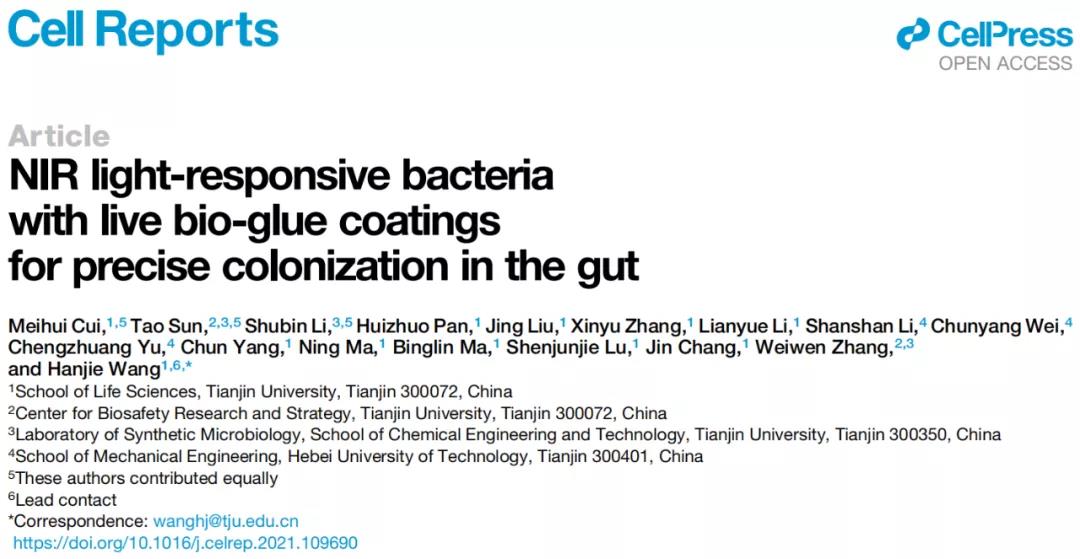 北京时间2021年9月14日晚23时,王汉杰课题组与天津大学化工学院张卫文团队孙韬合作,在Cell子刊Cell Reports发表了题为“NIR light responsive bacteria with live bio-glue coatings for precise colonization in the gut”的论文,将光遗传学技术中的光和转基因光敏蛋白质运用到微生物上,为解决生物活药工程菌在体有效可控定植提供了一种新思路。