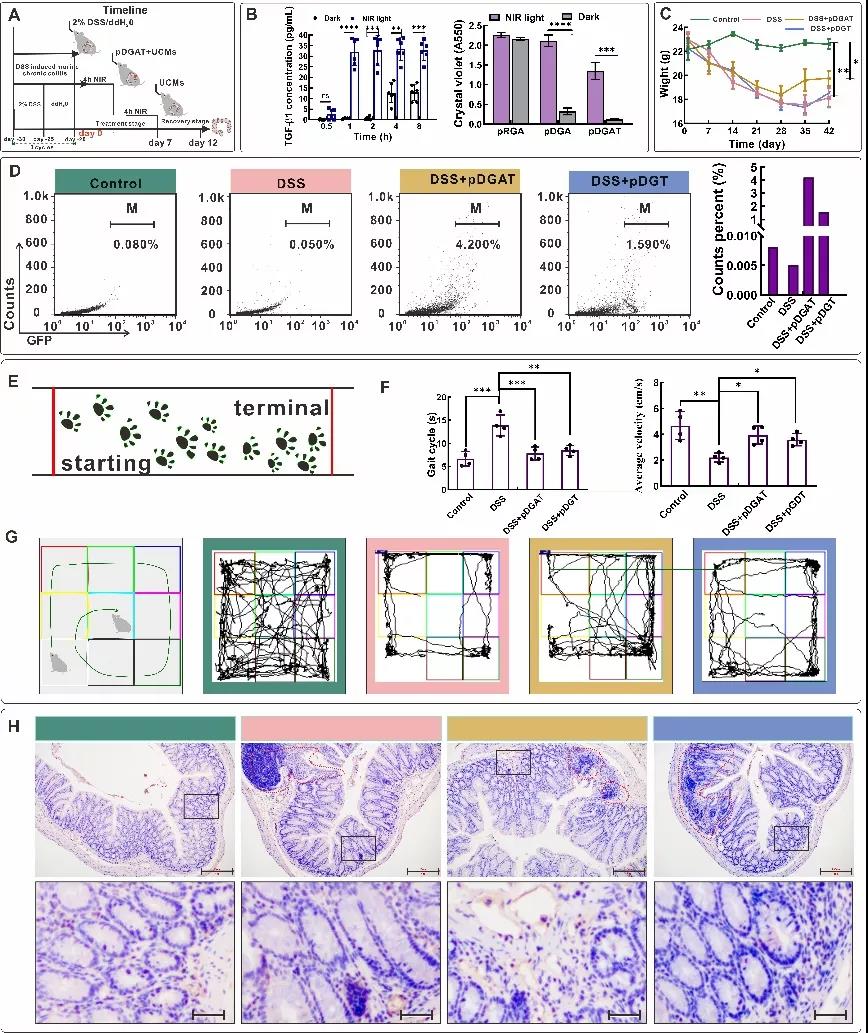 2,基于光响应生物黏附工程菌协同分泌抗炎因子的炎症性肠病治疗:我们使用了E.coli (Nissle 1917)的I型分泌系统,它可以将重组抗炎因子从胞内直接转移至胞外。在DSS诱导的小鼠慢性结肠炎模型中,从相应病症的防控角度入手该工程菌实现了对病程的延缓与阻滞。