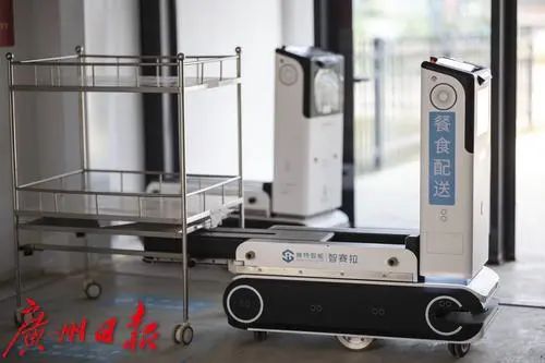 记者在A1组团看见,走廊内,工作人员正忙碌着打扫卫生,勾着货架的餐食配送的机器人正在各楼层间穿梭测试。