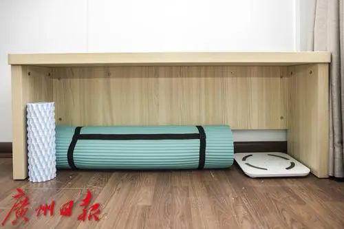 在书桌上配备了“健康防疫爱心包”,内有防护口罩、消毒剂、防疫香囊等等。考虑到隔离期间的锻炼需求,还贴心地配备了瑜伽垫等锻炼器材。
