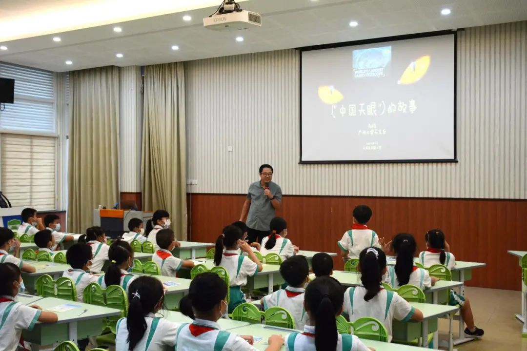 9月13日,2021年广州“院士专家校园行”活动走进广州市天河区华融小学。活动邀请了广州大学天文系副教授刘怡,以“中国天眼”的故事为主题,用生动、有趣的语言,给该校师生讲述其建造过程、建造意义、科学研究及其建设者的感人故事,激发同学们对天文学的好奇心,播下一颗渴望探索未知宇宙的科学种子,弘扬不畏艰难险阻、攻坚克难的科学家精神。
