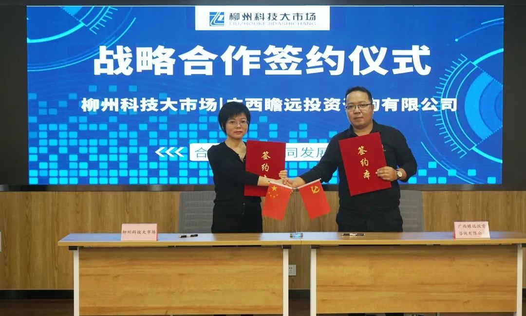 紧接着,柳州科技大市场与广西瞻远投资咨询有限公司举行了战略合作签约仪式。柳州科技大市场运营方广西博士海意信息科技有限公司常务副总汪华、广西瞻远投资咨询有限公司总经理陈默出席签约仪式并作为代表签署了战略合作协议。