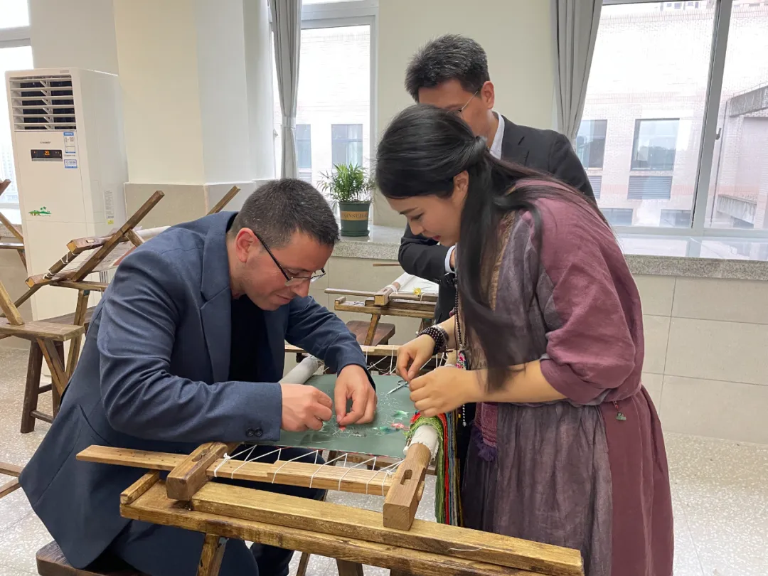 5月22日,阿尔及利亚驻华大使馆商务参赞哈乐法卫一行访问西部(重庆)科学城:哈乐法卫一行就科学城规划建设开展交流,随后参观了巴福镇西苑小学蜀绣基地。图为哈乐法卫正在学习制作蜀绣。