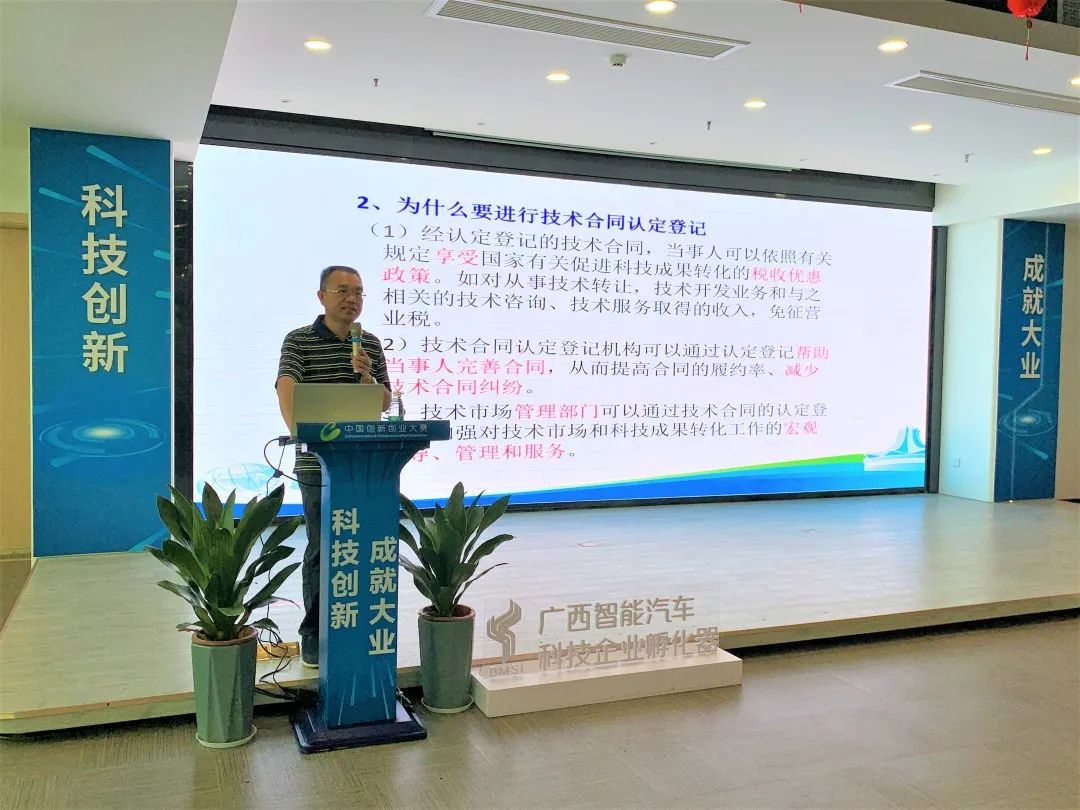 培训班上,广西东盟技术转移中心科技资源部副部长劳超首先为到场学员作《技术合同认定登记及相关税收优惠政策解读》培训。劳部长分别从技术合同的概念和特征、技术合同认定登记释义、税收优惠相关政策、技术合同认定流程及认定标准五个方面为大家详细讲解了技术合同登记要点,帮助学员了解政策内容,掌握认定登记流程。