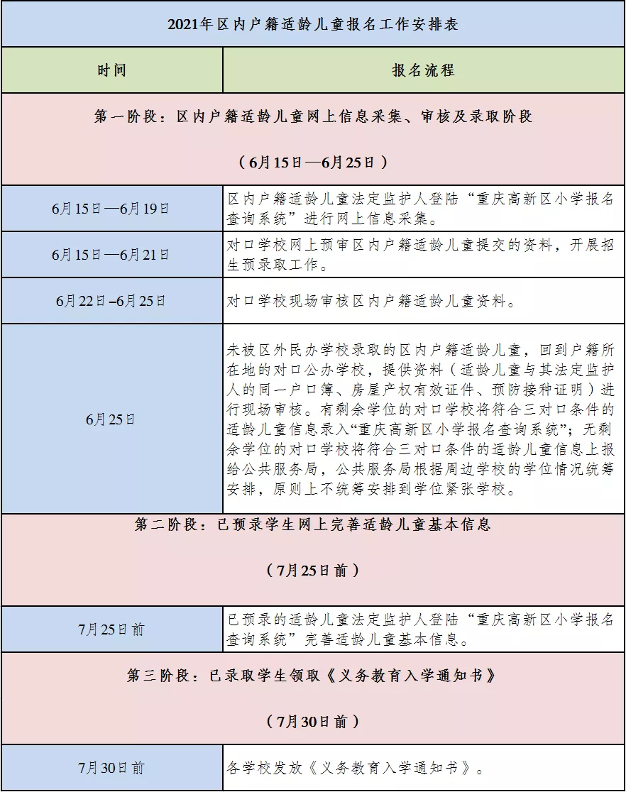 入读重庆高新区非学位紧张学校的区内户籍适龄儿童按“三对口”原则报名登记入学。