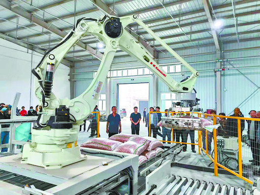在河南丰盛农业开发有限公司50万吨花生仓储物流园产品初加工车间,机械臂在码放筛选打包好的花生。