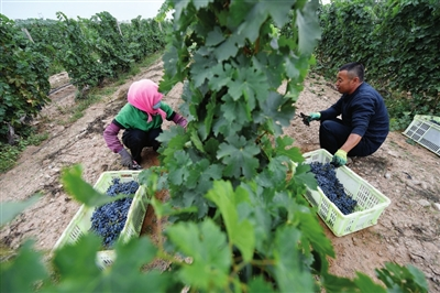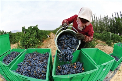 9月22日,在贺兰神葡萄酒庄,农民忙着采摘酿酒葡萄。记者 李靖 摄