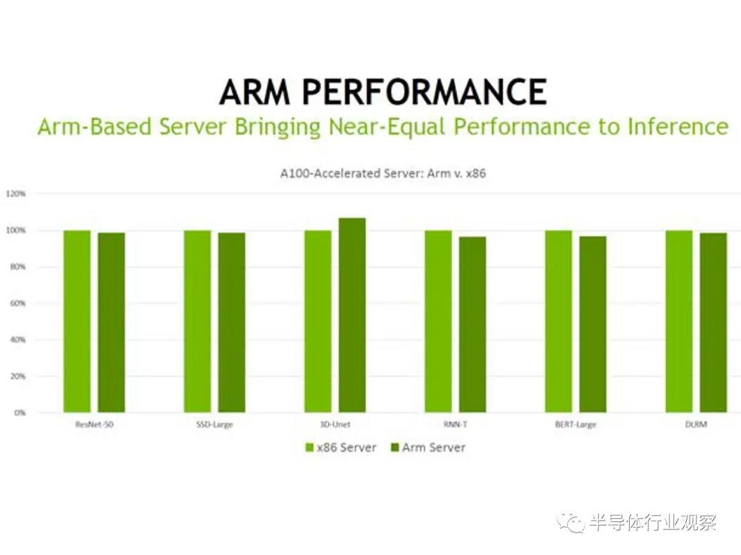 英伟达表示,它已经证明,当与用于 AI 应用程序(特别是机器学习推理)的 GPU 搭配使用时,基于 Arm 的 CPU 可以提供与基于 x86 的 CPU 几乎相同的性能水平。