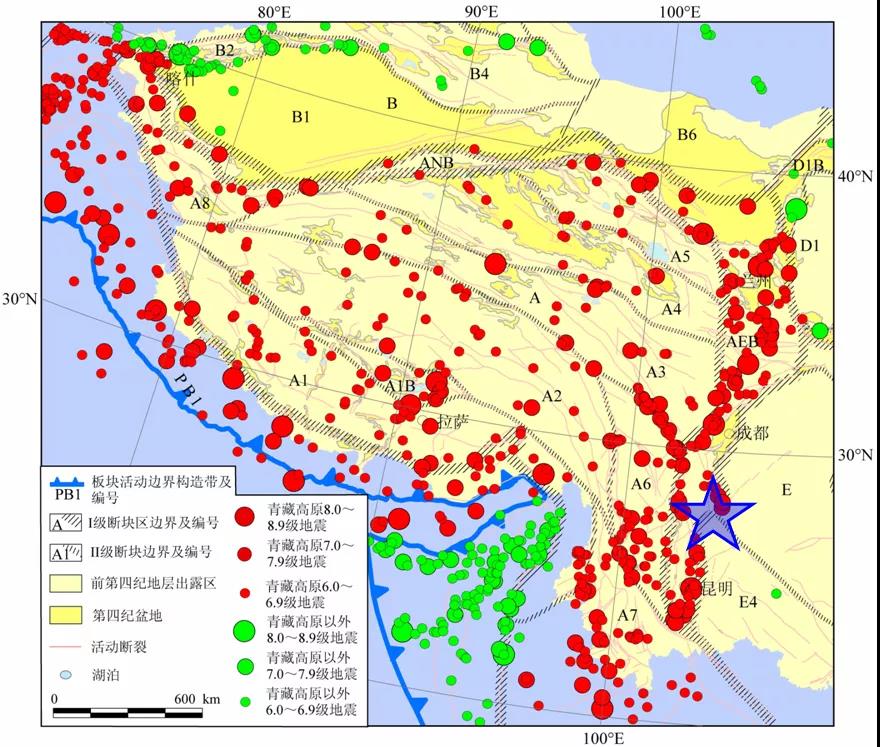 图2. 青藏高原活动构造分区与大地震(据邓启东等,2014)