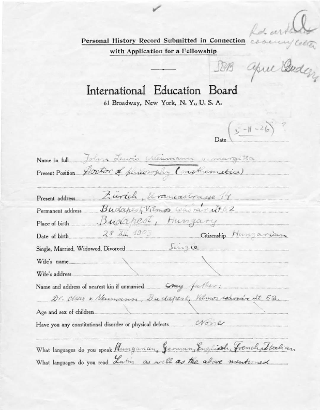 冯·诺伊曼向国际教育委员会申请奖学金(1926年)