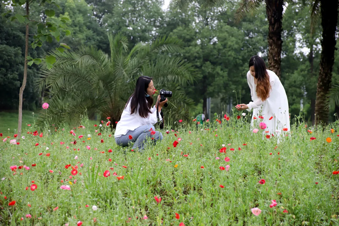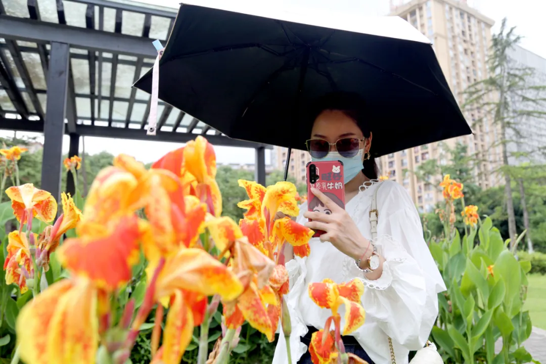 ▲市民在大学城中央公园的花丛中“打卡”。雷键 摄