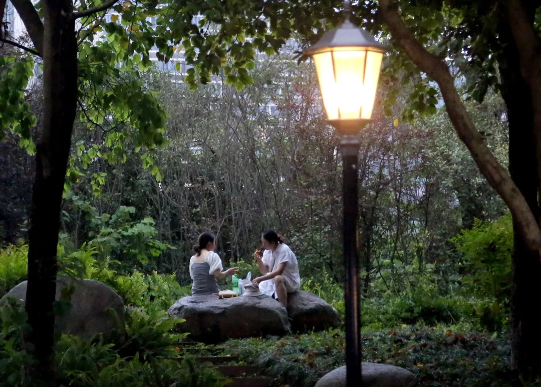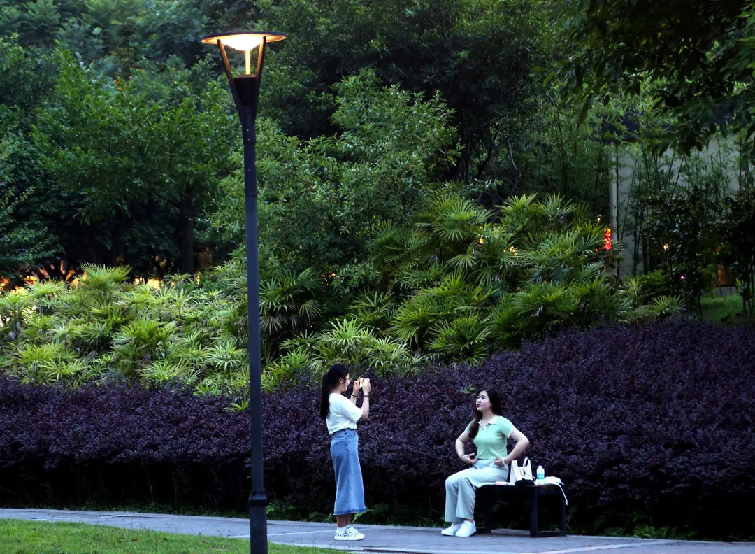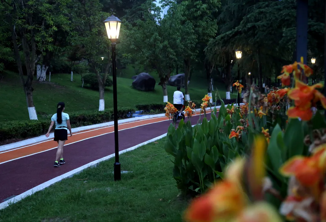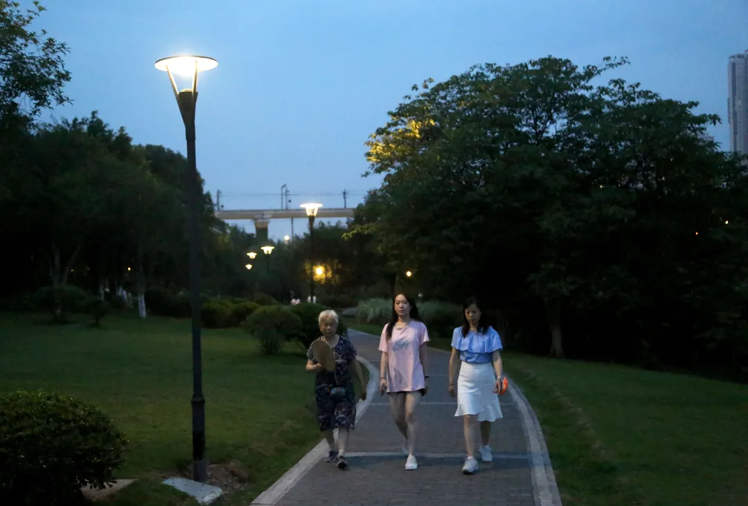 ▲傍晚,市民在公园明亮的路灯下散步。雷键 摄