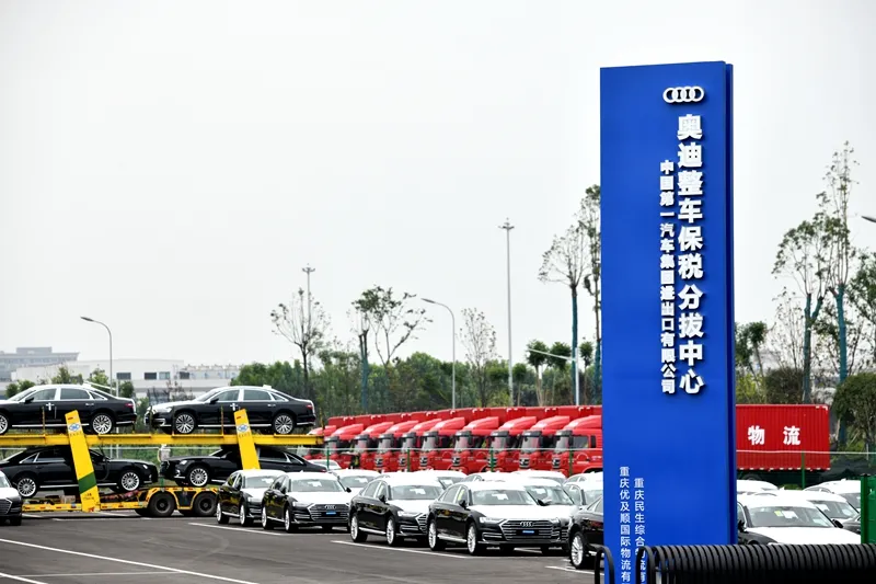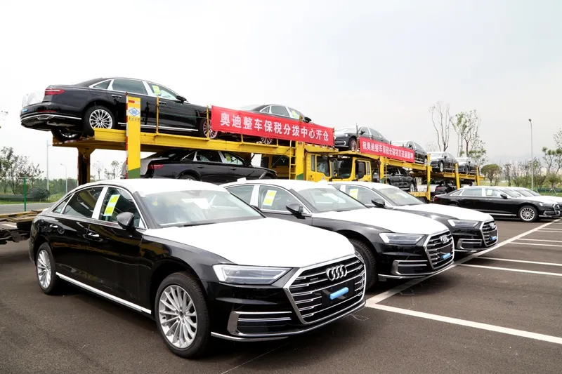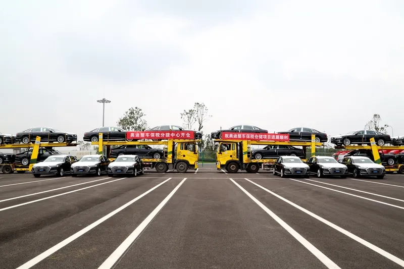 ▲82台奥迪A8L抵达西永综保区奥迪整车保税分拨中心仓储。邹乐 摄