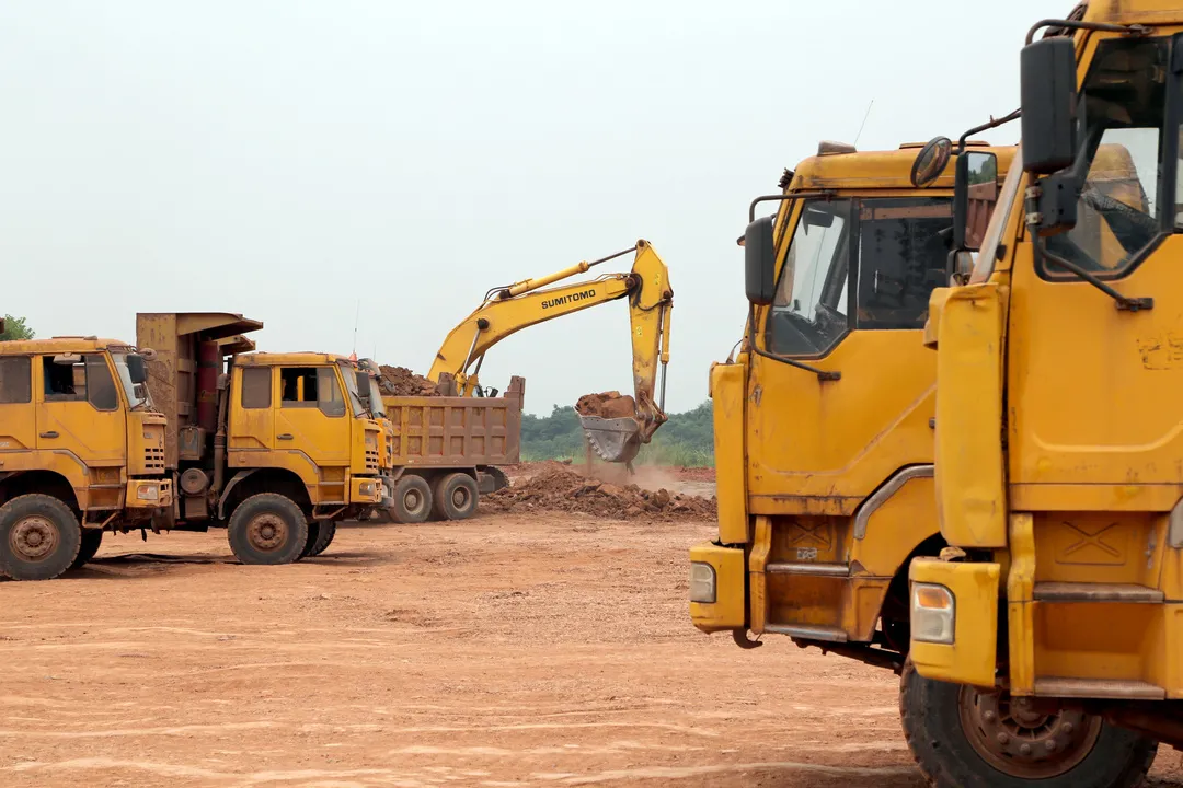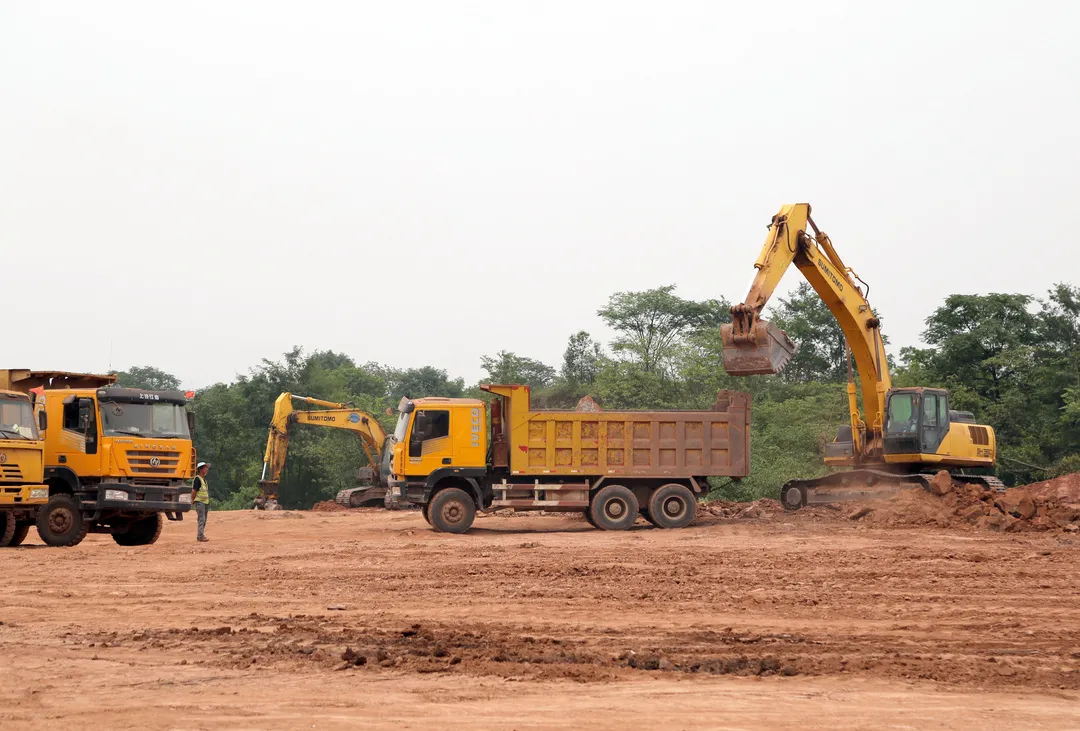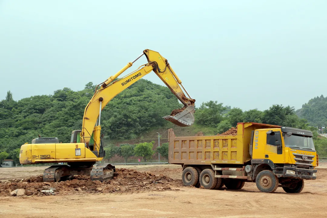 几辆挖掘机和运输车