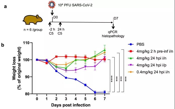 由于C5在体外整体表现最佳,因此研究人员选择了这一纳米抗体进行了进一步研究。通过给6只感染SARS-CoV-2后与人体症状相似的叙利亚仓鼠模型腹膜注射C5纳米抗体,研究人员发现,这款纳米抗体能够让受感染的小鼠疾病症状显著减轻,并且7天后体重减轻的程度远低于未接受纳米抗体治疗的仓鼠。另外,与对照组相比,接受纳米抗体治疗的仓鼠在 7 天后肺部和呼吸道的病毒载量也较低。