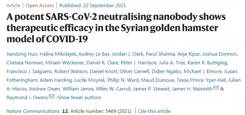 当地时间9月22日,英国牛津大学威康人类遗传学中心的研究人员领衔在《Nature Communications》上发表了一篇题为“A potent SARS-CoV-2 neutralising nanobody shows therapeutic efficacyin the Syrian golden hamster model of COVID-19”的研究报告。
