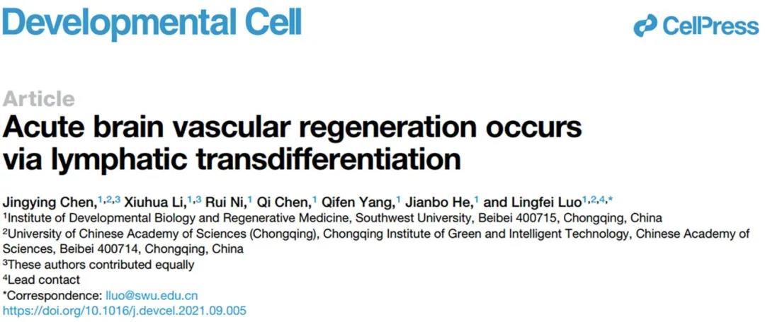2021年9月24日,罗凌飞组在Developmental Cell杂志上发表文章 Acute brain vascular regeneration occurs via lymphatic transdifferentiation ,进一步发现脑梗后在受损脑区最早形成并最快恢复血流的应急新生血管是由内生脑膜淋巴管转分化形成,这些应急新生血管对于重度脑梗后维持个体生命至关重要。