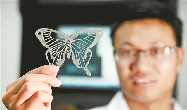 4月28日,重庆大学煤矿灾害动力学与控制国家重点实验室,技术人员龙海洋展示用高压“水刀”制作完成的精美的金属蝴蝶。特约摄影 钟志兵/视觉重庆
