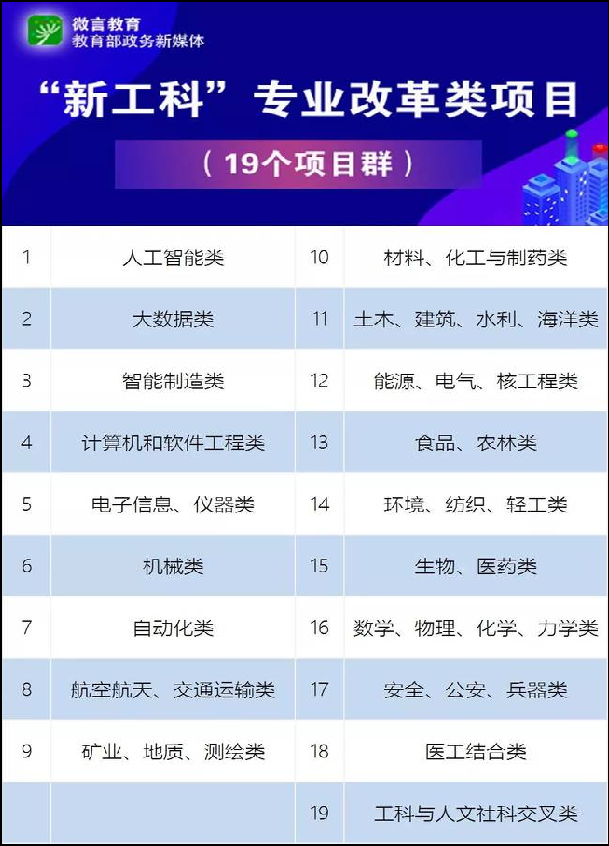 而在教育部公布的首批“新工科”研究与实践项目名单,包括了202个“新工科”综合改革类项目和410个“新工科”专业改革类项目。其中,“新工科”专业改革类涵盖了19个项目群。其中前七个项目群分别是人工智能类、大数据类、智能制造类、计算机和软件工程、电子信息、仪器类、机械类、自动化类。这无疑是都与人工智能+机器人非常贴近。